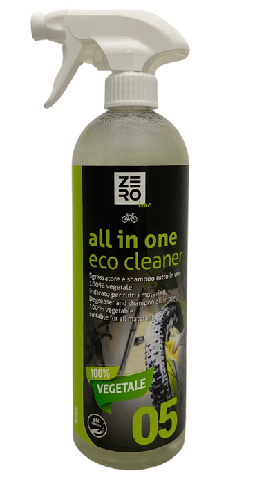 SGRASSATORE E SHAMPOO TUTTO IN UNO 100% VEGETALE   Formulazione 100% vegetale priva di alcun prodotto petrolchimico, a pH neutro e VOV FREE (privo di sostanze volatili nocive). ALL IN ONE ECO CLEANER è la soluzione ideale per la pulizia di tutta la bicicletta: telaio, trasmissione...